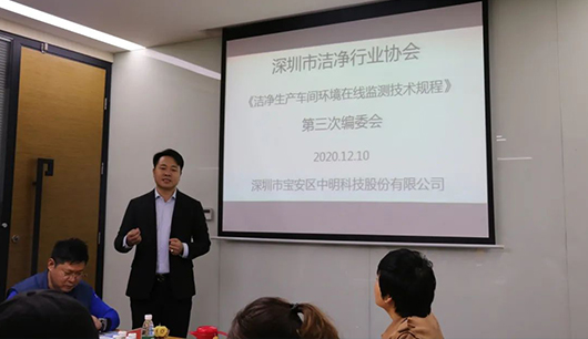 2020年12月10日,由深圳市潔凈行業(yè)協(xié)會(huì)發(fā)起、深圳市中明科技開發(fā)股份有限公司主編及各參編單位參與的深圳市潔凈行業(yè)協(xié)會(huì)第二項(xiàng)團(tuán)體標(biāo)準(zhǔn)《潔凈生產(chǎn)車間環(huán)境在線監(jiān)測(cè)技術(shù)規(guī)程》第三次編委會(huì)會(huì)議在深圳市中明科技開發(fā)有限公司召開。